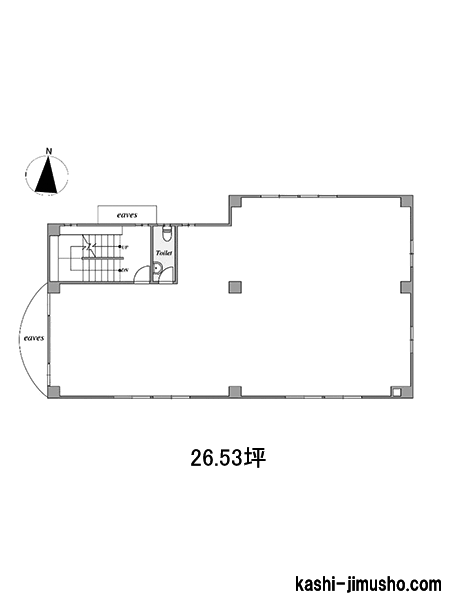 大通りに面しているので視認性に優れています。シンプルな形状でレイアウトのしやすい貸室です。トイレは室外で男女別にわかれています。
